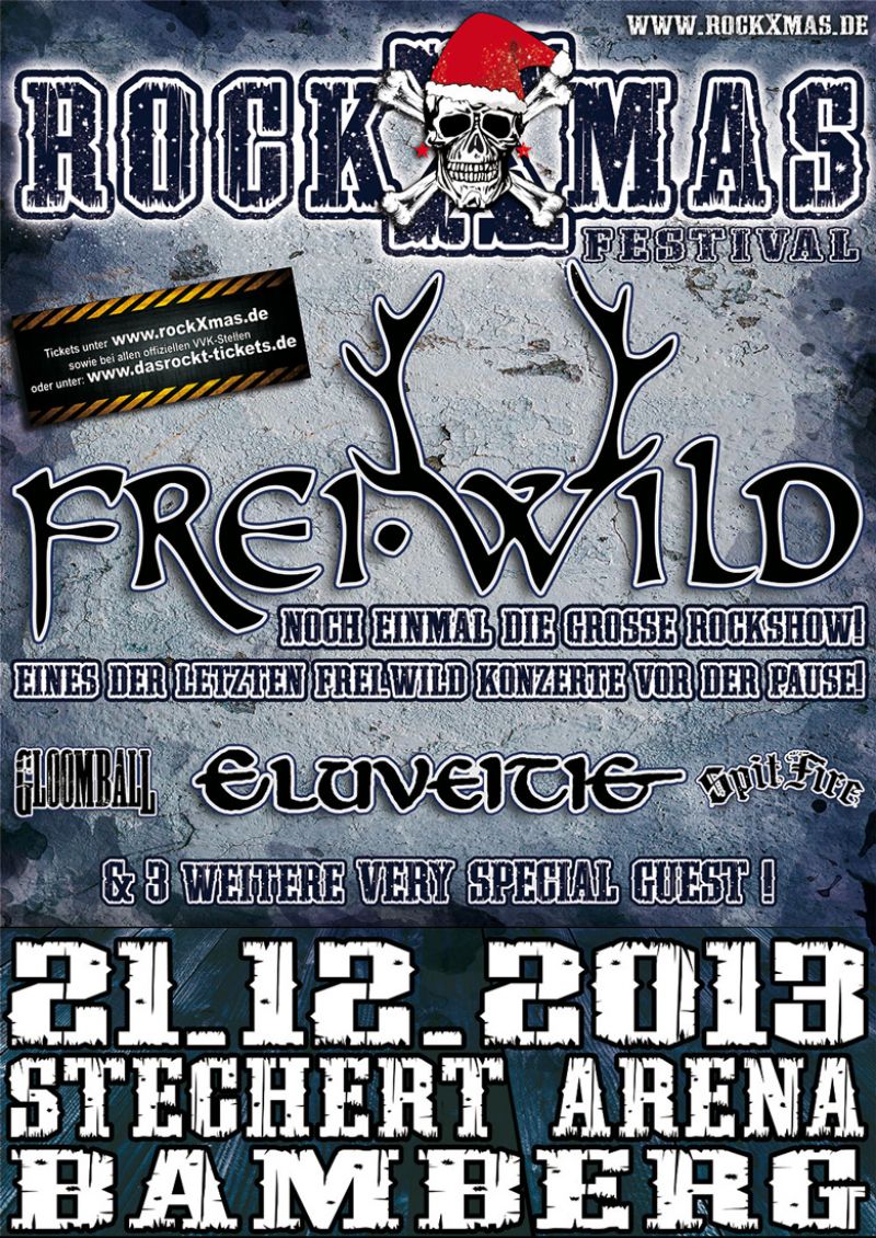 X-MAS 2013 beginnt in Frei.Wilds Ländereien dieses mal schon außerplanmäßig am 21.12.13. Die musikalische Bescherung findet dieses mal in der Stechert Arena in Bamberg statt, wo wir uns neben weiteren namhaften Acts (wir kennen die auftretenden Bands allesamt schon, obwohl sie erst später veröffentlicht werden dürfen ;-) ) in ein hochklassiges Billing einreihen dürfen, welches nicht unbedingt Frei.Wild typisch ist.