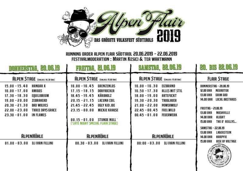 Hier nun der aktuelle Spielplan für das Alpen Flair 2019. Soweit wir wissen, steht das Festival kurz vor dem erneuten „Sold Out“! Martino Senzao, unser quirliger Ladenhüter vom R+K Store in Brixen hat noch ein paar wenige der begehrten Tickets! Somit gilt, wer uns bei unserem Heimatfestival im wunderschönen Natz erleben möchte und auch sonst auf ein geiles Rahmenprogramm steht, hat hier nun jetzt die letzte Chance! KLICK